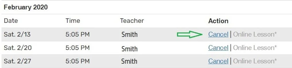 Click “Cancel” next to the lesson you would like to cancel.